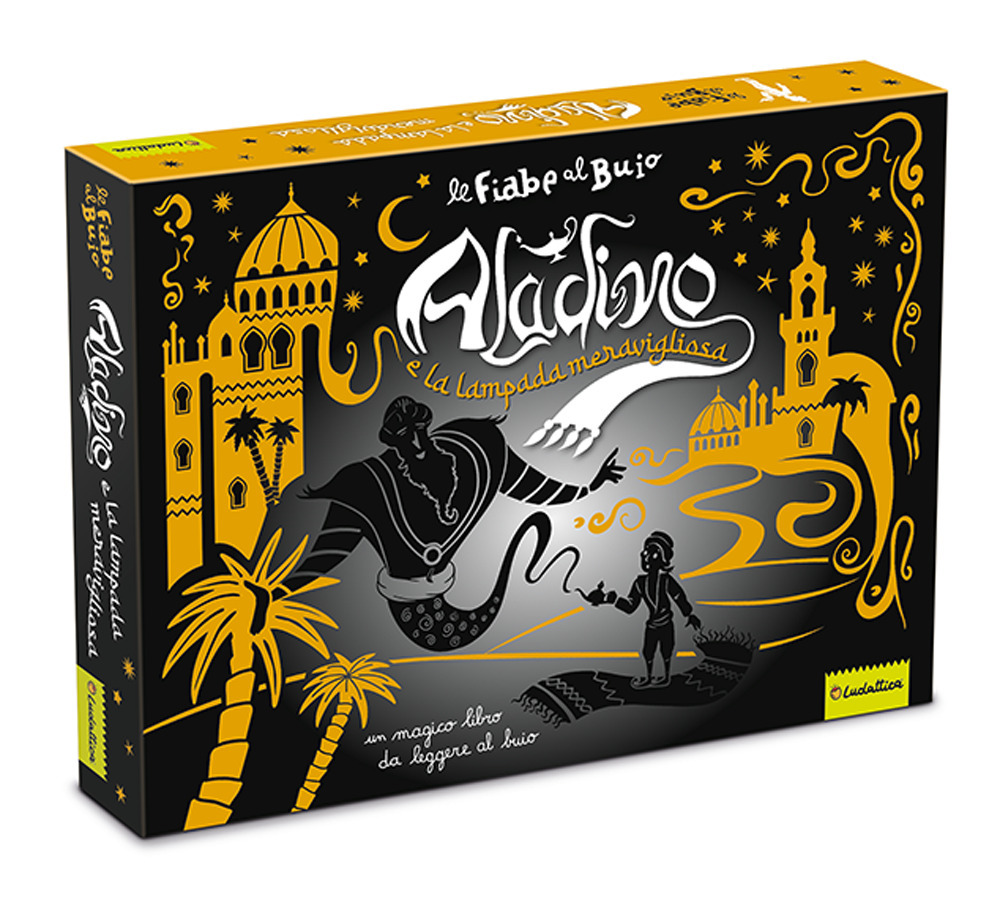 Un libro da leggere al buio con l’aiuto della torcia inclusa cofanetto, che racconta, per immagini, la storia di Aladino e della lampada meravigliosa. Le illustrazioni, realizzate in nero come silhouettes, rende la narrazione particolarmente suggestiva per i piccoli lettori. Età di lettura: da 4 anni.