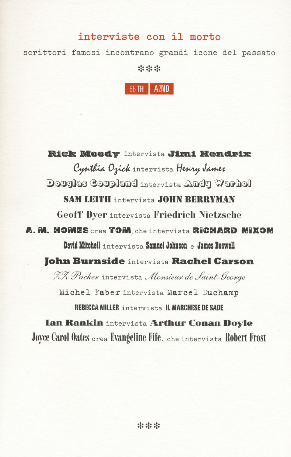 Alcuni importanti scrittori si confrontano con i loro miti in tredici interviste impossibili, dove le icone del passato vengono trascinate in conversazioni semiserie, a volte esilaranti, e costrette a fare i conti con l’immagine che hanno lasciato ai posteri. E così Nietzsche si ritrova a tenere testa a un Geoff Dyer sotto effetto di droghe che lo assilla con domande assurde sui concetti-cardine della sua filosofia; Jimi Hendrix si lamenta con Rick Moody che nell’aldilà non ci sono chitarre decenti; Henry James è incalzato da Cynthia Ozick che vuole convincerlo a fare coming out; e Robert Frost si vede messo all’angolo da Evangeline Fife, una giovane e ingenua poetessa creata da Joyce Carol Oates.